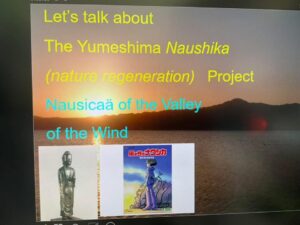 最後に万博に行ったことがある人?と手をあげてもらったらかなりの子どもたちが手を挙げてくれた。その中の生徒さんに「何が感動的だったか?」尋ねた。国の名前をいろいろあげてくれた生徒さん、またリングの上を歩いたよかったという生徒さんもいた。そこで、そもそもあそこは関西の人たちのゴミを集めてつくった島なので、これから島を再生するために、水源の森のタネを植えて、森をつくろうという計画がある、風の谷のナウシカの物語りにならって、「夢洲ナウシカ計画」といいます。これに協力してくれますか?と尋ねたら多くの生徒さんが手をあげてくれた。