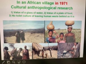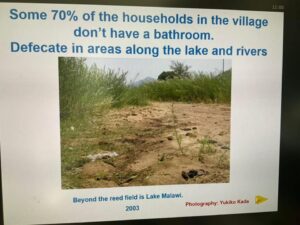 また日本では昭和30年代に水道がはいるまで、人間のし尿は便所で集めて田畑の肥料になったこと。アフリカでは、今も水道もないけど、し尿を水辺にそのまま放置するので、子どもが水系伝染病になって死亡率高いことなども伝えました。2020年の世界地図を示し、4人に1人の人が安全な水を飲めないこと、2人に1人が安全なトイレがないこと。特にアフリカではたとえば、私が調査をしていたマラウィ湖辺の村では7割の家にトイレがなくて、皆、浜辺のヨシの影などで排尿、排便をすること。