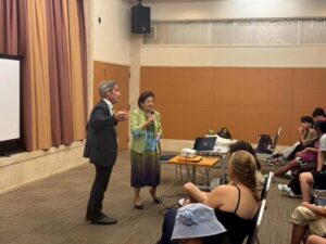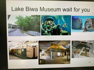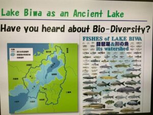 その後、琵琶湖の多面的役割、古代湖として固有種の魚も多くて、その魚食も大切な文化であることを話しました。ここで「Have you heard about Bio-Diversity?」と生物多様性について知っているか尋ねたところ、コスタリカからきている生徒さんが、すぐに手をあげて、「私の国は生物多様性で有名だ」と言ってくれました。そこで、同時に「コスタリカには軍隊もなくて、とっても平和な国ですよね」と加えたら「そうだ!」と皆に誇らしげに語ってくれました。