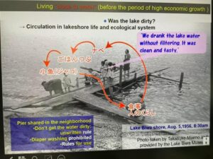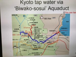 全体のタイトルは「Think Beyond the Tap water― Lake Biwa and Mt. Hiei ―」としました。蛇口の向こうについて考えてみよう!と呼びかけまず京都と琵琶湖をつなぐ琵琶湖疏水について話をし、京都市民の水道の水は100%琵琶湖から、と呼びかけました。次にそれぞれの住まいを尋ねました。京都府下、大阪市内、大阪府下、神戸市内や兵庫県内はいませんでしたが、75名ほぼすべてが琵琶湖水供給地域に住んでいることが判明。