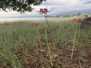 「嘉田由紀子びわ湖便り9月26日」、琵琶湖岸もようやく秋めいてきて、湖岸の彼岸花も芽をだし、花を開きはじめました。比叡山を遠景に、浜辺の彼岸花は崇高な感じがただよっています。ただ琵琶湖水位はマイナス48センチとかなり下がっています。琵琶湖水温は27度。このまま雨が降らず水温も高く、琵琶湖の水位が低いと、アユの産卵が進むかどうかとっても心配です。川の水量も多くて水温が20度くらいまでさがり、琵琶湖の水位も高いと、アユの産卵には最適です。9月26日。