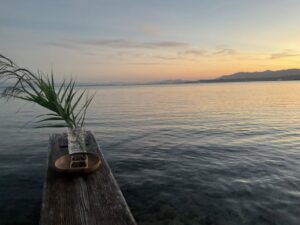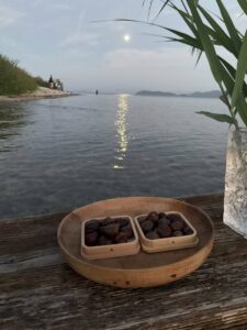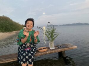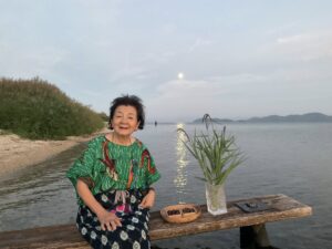10月6日 中秋の名月の夕方、琵琶湖西岸の比良浜から、対岸の沖島の上に出た名月を愛でながら、橋板にススキをかざして湖上のムーンロードを楽しむ。浜辺にちょうどタイから来たという旅人の女性が月を見にきていたので、カメラのスイッチを押してもらう。タイでも月見は楽しむという。月見団子の代わりに乾燥中のトチノミをお供えしました。浜辺から家に戻ったとたん、6時半のNHKニュースで日本人がノーベル賞受賞のニュース!それも滋賀県長浜市出身の坂口志文さんという。滋賀県出身でははじめてのノーベル賞!!坂口さん、ご関係の皆さま、おめでとうございます!10月6日。(また2000文字です、長くてスミマセン)。