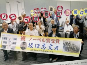 お兄さんの坂口偉作さんが「やっととれた、いちばん待ち焦がれていのは母だったろう。昨年105歳でなくなった。すぐ近くの寺に墓があるので、すぐに報告できます。”持続は力“です」とインタビューにこたえていました。またある同級生が「坂口はいつも寝ていた。先生のいうこと全部わかっていたんだろう。理科系だけでなく、文学にも詳しく、樋口一葉全集なんかも高校生で読み込んでいた。ふるさとに帰って皆で語り合いたい」とにこやかに語っておられました。