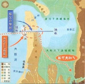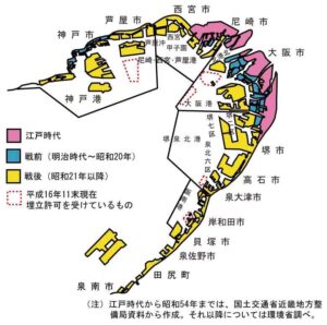 そもそも大阪湾は、縄文時代には奈良県から生駒山地をぬけて元大和川が流れ込み、東大阪あたりは湿地帯でした。江戸時代に大和川を堺方面に移して、放水路として今の大和川となります。大阪湾岸での干潟の干拓や埋め立ては江戸時代からはじまります。図に示してありますが、ピンクの部分が江戸時代、水色部分は戦前、黄色の部分は昭和21年以降です。この図は平成16年段階でまた夢洲のところは点線で囲まれていますが、平成後半に今の夢洲の土地が完成します。
