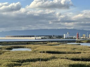次に夢洲のとなりの「大阪南港野鳥園」を訪問しました。理事長の高田博さんたちがご案内下さいました。野鳥を愛する地元住民の皆さん「南港の野鳥を守る会」(1969年発足)の熱望が実り、シギ・チドリ類等の生息場所を確保するために、大阪市が国の補助金をうけて1983年に開園したという。万博開催地の夢洲の隣接地で、湿地の向こうには大屋根リングがみえます。理事長の高田博さんがご案内下さいましたが、ボランティアの皆さんが種別の飛来数を記録し、公表しています。シギ・チドリ類以外にもサギ、カイツブリ、カモ、タカ、カモメ、また植栽エリアの森部分にはハト、カワセミ、モズ、ツグミ、ウグイス、ヒタキなど飛来しています。