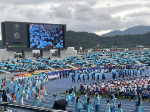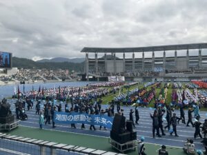 開会式の企画は、ウェルカムフェスタでは、近江高校などの吹奏楽、びわ湖ホールのアンサンブルと生の演奏で、大会イメージソング「シャイン!!」の合唱が会場全体にひろがります。和太鼓演奏や伊吹高校書道部の筆演出は見事でした。各都道府県、政令市の入場の最後には、滋賀県選手団の入場。びわ湖周航の歌を行進用に編曲して、思わず口ずさんでしまいました。