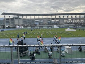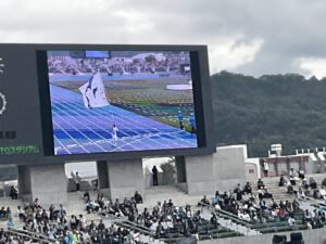 ダンスアトラクションでは、会場全体をびわ湖色のブルーで染めあげました。国スポの開会式と同じ指向で、会場全体を琵琶湖に見立て、秋篠宮皇嗣同妃両殿下もブルーのタオルで、参加くださいました。開会式の三日月知事の挨拶では、手話をおりまぜ、障スポらしい心意気が示されていました。障スポの開会式も迫力あり、よかったです。滋賀県職員は、研究職など、すべての職場から応援に駆り出されているようで、皆さん、ご苦労さまです。ボランティアの皆さんのご尽力にも感謝です。