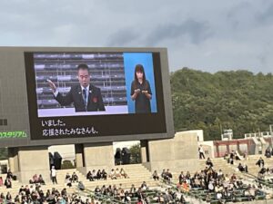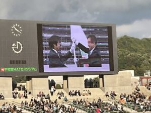 三日月知事の閉会式挨拶、宮下青森県知事への来年の旗わたし、そして田島一成彦根市長の閉会挨拶。最後には,西川貴教さ主演のサヨナラコンサート!!そして県下各地の高校生による吹奏楽による送り出しのサヨナラ音楽祭!!