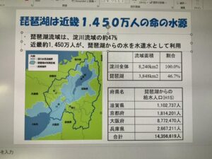 これをみていただきますと、湖北では年間2400ミリ以上のメッシュが多くなっています。しかも月別降雨量は年間平均しています。一方、南部地域では年間降雨量は1600ミリ以下です。これらの降雨が琵琶湖に注ぐ一級河川118本、小さな小溝までいれたら400本近くの水として琵琶湖に流れこみます。またその琵琶湖水は京都、大阪、兵庫県まで1450万人の皆さまの「命の水源」となっています。関西空港でも兵庫の有馬温泉でも琵琶湖水が供給されています。日本だけでなく、国際的にみてもその水源としての安定性と広範性は他に追随させない水資源と言えるでしょう。