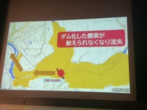 各地域からの報告もあり、人吉市の木本雅己さんからは、2020年7月4日の球磨川水害では人吉市内の20人の溺死者の原因は球磨川本流からの氾濫ではなく、山田川、万江川、御溝川など、上流から市内に流れ込む支川流が原因であること、また川辺川が球磨川に合流する地点でのくまがわ鉄道第四橋梁に大量の放置された材木がひっかかりできた人為ダムの破裂による鉄砲水で球磨川本線氾濫が起きたことも詳しく説明くださいました。上のこと、いずれも国土交通省も熊本県も認めようとしません。