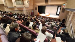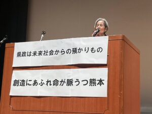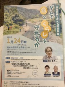 熊本市内で、『ダムで命を守れるか? 気候危機を考える県民集会』というシンポジウムが開催され、元熊本県知事の潮谷義子さんの講演、弁護士の松野信夫さんとディスカッションに参加。潮谷さんの講演は「県政は未来の子どもたちからの預かりもの」という意識で、2000年に熊本県知事に就任してから、川辺川ダム問題についての住民対話の会議を開催し、2003年の利水訴訟勝利などを勝ち取る支援を行ったことなど、心を込めてわかりやすく語ってくださいました。多くの方が深く共感しておられました。1月24日。