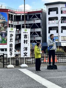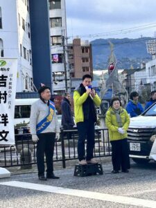 草津駅西口では、でじ真吾さんの応援、私は法務省職員として外国人政策などを担ってきたでじさんの経験や、幼い子どもさんをかかえるお父さんとしての経験も、政策に活かしていってほしいと短く応援。吉村さんとは入れ替わりで、彦根へ移動。彦根市内では、岡屋きょうすけさんの応援。中日新聞記者として滋賀県内をくまなく歩き、人びとの声をきいて記事にしていた経験。また法律を学んできた経験や、衆議院議員、参議院議員の公設秘書をしてきた経験から即戦力で働ける強みを紹介しました。