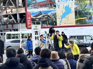 吉村さんが到着される頃には大津京駅前はたいへんな人だかりで、動画配信などもあり、大変もりあがりました。寒い中、長い時間、演説につきあっていただいた皆さまに深く感謝申し上げます。