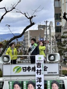 1月30日(金)、衆議院選挙の応援活動、朝から吉村洋文日本維新の会代表を迎えて、滋賀県内4ケ所で、どこも大変力のこもった応援演説をいただきました。①石山駅前デッキで斎藤アレックスさん、⓶草津駅西口で、でじ真吾さん、③彦根市ドン・キホーテ前で、岡屋きょうすけさん、④大津京駅前で斎藤アレックスさんです。大津、草津は晴れていたのに、八日市から北は大雪!吉村代表も驚いていましたが、吉村さんには、滋賀県琵琶湖集水域には日本でも有数の多雪地帯があり、だから琵琶湖の水源が冬も安定しているので、大阪の皆さんも知ってください、とお伝えしました。