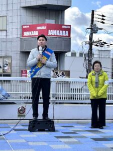 石山駅前デッキでは、まず私から、斎藤アレックスさんの教育無償化にかける思いを、ご自身の子ども時代から、ひとり親で苦労をしてきたお母さんの姿をみて、政治を変えたいという思いを紹介させていただきました。この4月から全国の小学校での給食費の国費支援、今年度4月から公立高校の授業料支援、新年度の4月から私立高校の授業料支援について、具体的に紹介させてもらい、アレックスさんが、維新の会の政調会長として、渋る自民党を説得して予算確保をしてきたことを紹介いたしました。