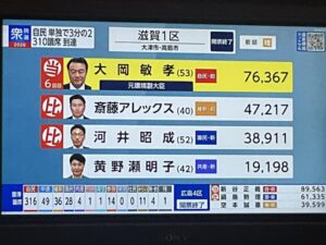 滋賀県内での一区斎藤アレックスさんは選挙区ではやぶれましたが、比例復活が可能となりました。日本維新の会の政策づくりの要役として今後も全力で活躍することに期待します。