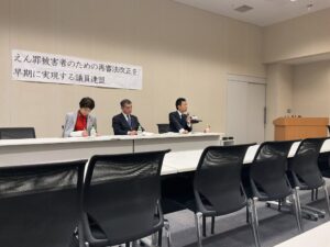 2024年3月に、国会では200名以上の超党派の国会議員により「えん罪被害者のための再審法改正を早期に実現する議員連盟」が発足しました。「えん罪は国家による最大の人権侵害」であり、私も最初からこの議連に参加をしてきました。上のように日野町事件や湖東記念病院事件に直面してきたからです。その日野町事件の最高裁判決があった直後の2月26日には議連の会合があり、そこでは、日野町事件の判決をうけて、議連案と法務省案の違いをはっきり整理して、各政党、会派で研究をして、最善の方向をだしましょう、と私自身訴えました。
