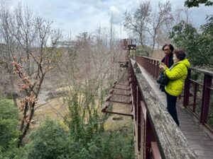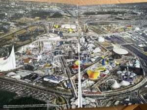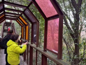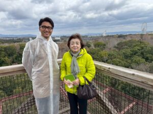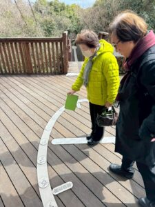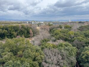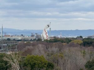 圧巻は、展望タワーからの太陽の塔や国立民族学博物館の建物、公園外の阪大病院のビルやはるかかなたの大阪市街地のビル群を、その周囲を囲む丘陵地帯だ。スギ花粉飛散日だったのでできるだけ速やかに退散しましたが十分に楽しめます。また森の上をあるく「ソラード」も樹木の種類や鳥の声を楽しみながら、中には「集音装置」や「動物の目になって色づけできるパネル」など、吉村さんの遊び心が存分に埋め込まれています。また階段部分もあえて石の配置を不揃いにしていて、デザイン的にも工夫がこらされています。