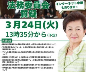 直前案内で恐縮ですが、明日、2026年3月24日(火)朝10時から午後3時過ぎまで、今特別国会初めての参議院法務委員会質疑です。